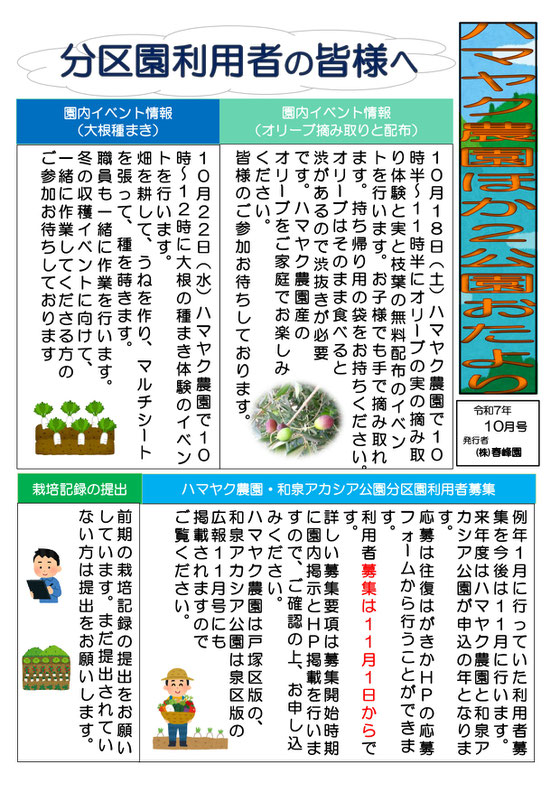 2025/10/07 【おたより】おたより10月号 こんにちは。 おたより10月号を発行しました! 園内イベント情報(オリーブ摘み取りと配布)について、園内イベント情報(大根種まき)について、ハマヤク農園・和泉アカシア公園分区園利用者募集について、栽培記録の提出についてまとめました。 ハマヤク農園ほか2公園おたより 10月号.pdf PDFファイル 295.9 KB ダウンロード tagPlaceholderカテゴリ: